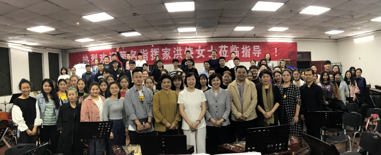 邀请,著名指挥家、国家一级指挥洪侠女士,河南省歌舞演艺集团副总经理、二胡演奏家杜宏亚一行来校交流指导。校党委常委、工会主席沈洁霞在排练现场会见了洪侠女士一行。