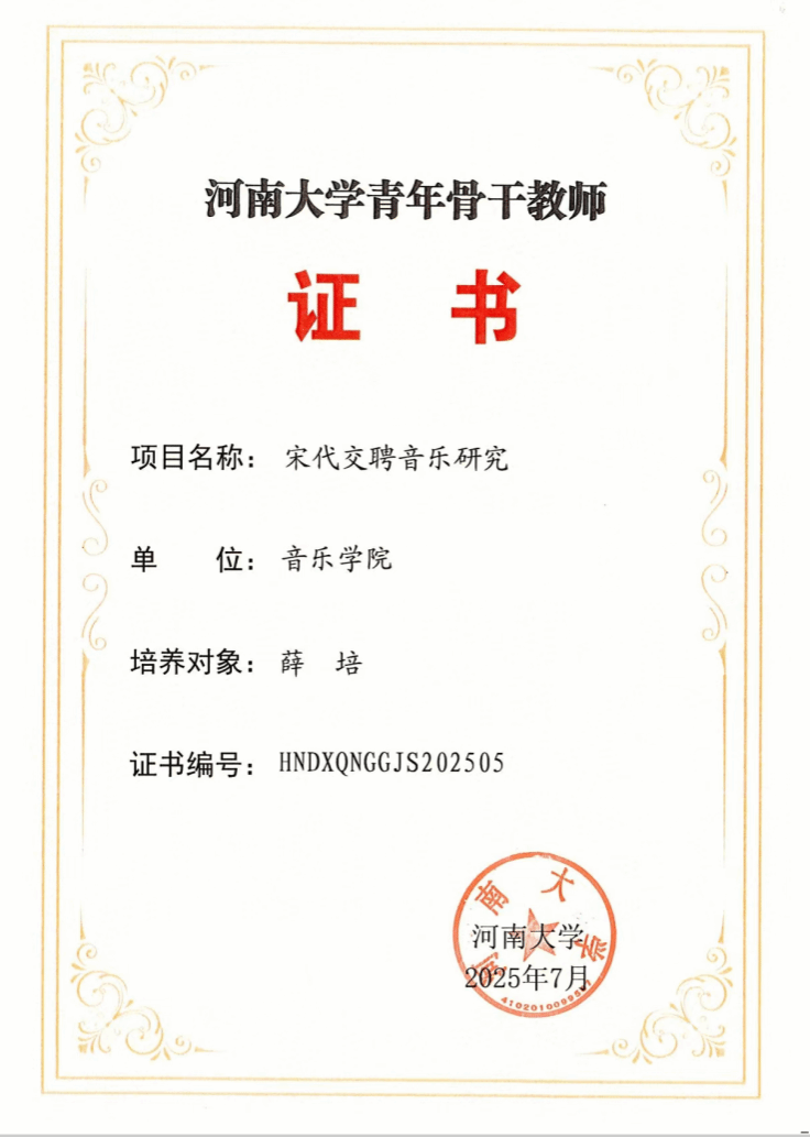 薛培副教授此次申报“河南省本科高校青年骨干教师”的项目名称为《宋代交聘音乐研究》,聚焦复杂政治环境下宋代音乐的跨政权互动,如辽、金、西夏等,具有较强的学术创新性。该研究将直接转化为课程教学资源,深度赋能中国音乐史相关课程,升级课程内容,创新教学方法,丰富课堂知识的同时,进一步拓宽宋代音乐研究领域,从艺术层面为铸牢中华民族共同体意识再添明证。