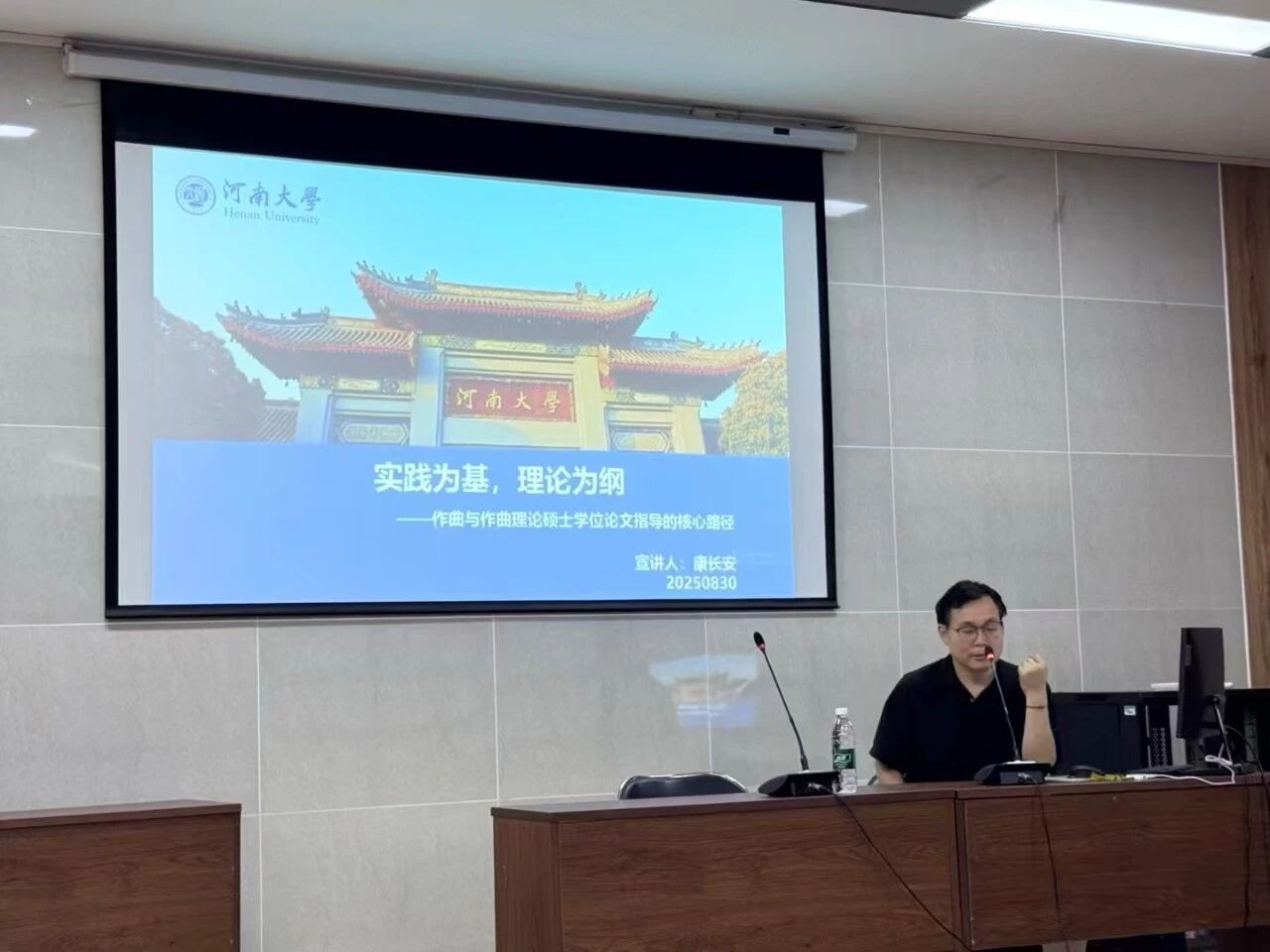 下午的培训同样精彩。首先,金亚迪老师分享了关于教学技能竞赛和教学创新大赛的比赛经验。她结合自身参加各类教学比赛的经历,从课程设计、教学方法创新、课堂互动技巧等方面,毫无保留地分享了宝贵经验,为导师们优化课程教学、提升教学水平提供了新思路。随后,康长安主任以“实践为基,理论为纲——作曲与作曲理论硕士学位论文指导的核心路径”为主题分享了关于优秀硕士论文指导老师方面的经验,他从论文选题、开题指导、中期检查到最终答辩等各个环节,详细介绍了指导研究生撰写优秀论文的方法与技巧,并结合典型案例,强调了培养研究生科研创新能力的重要性。导师们认真学习,积极借鉴优秀经验,纷纷表示将把所学运用到今后的研究生指导工作中,助力研究生成长成才。