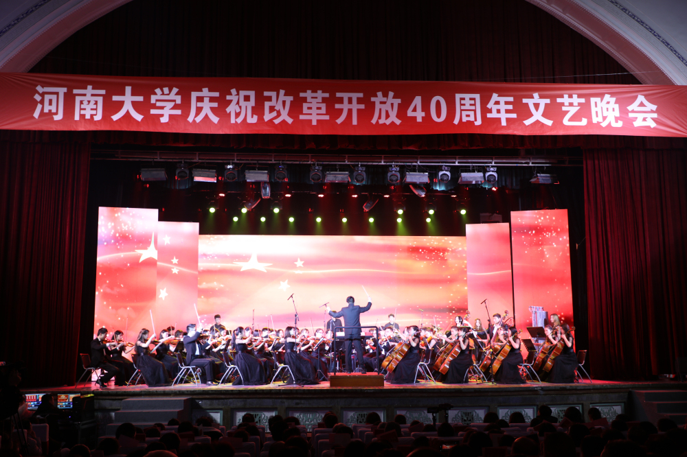 伴随着序曲交响乐《红旗颂》与交响合唱《向往》的奏响,晚会正式拉开帷幕。本次晚会共分为“希望的田野”、“春天的故事”、“崭新的时代”、“美丽中国梦”和“辉煌新起点”五个乐章,河大师生用动人的艺术语言讲述了祖国改革开放40年的华彩乐章。