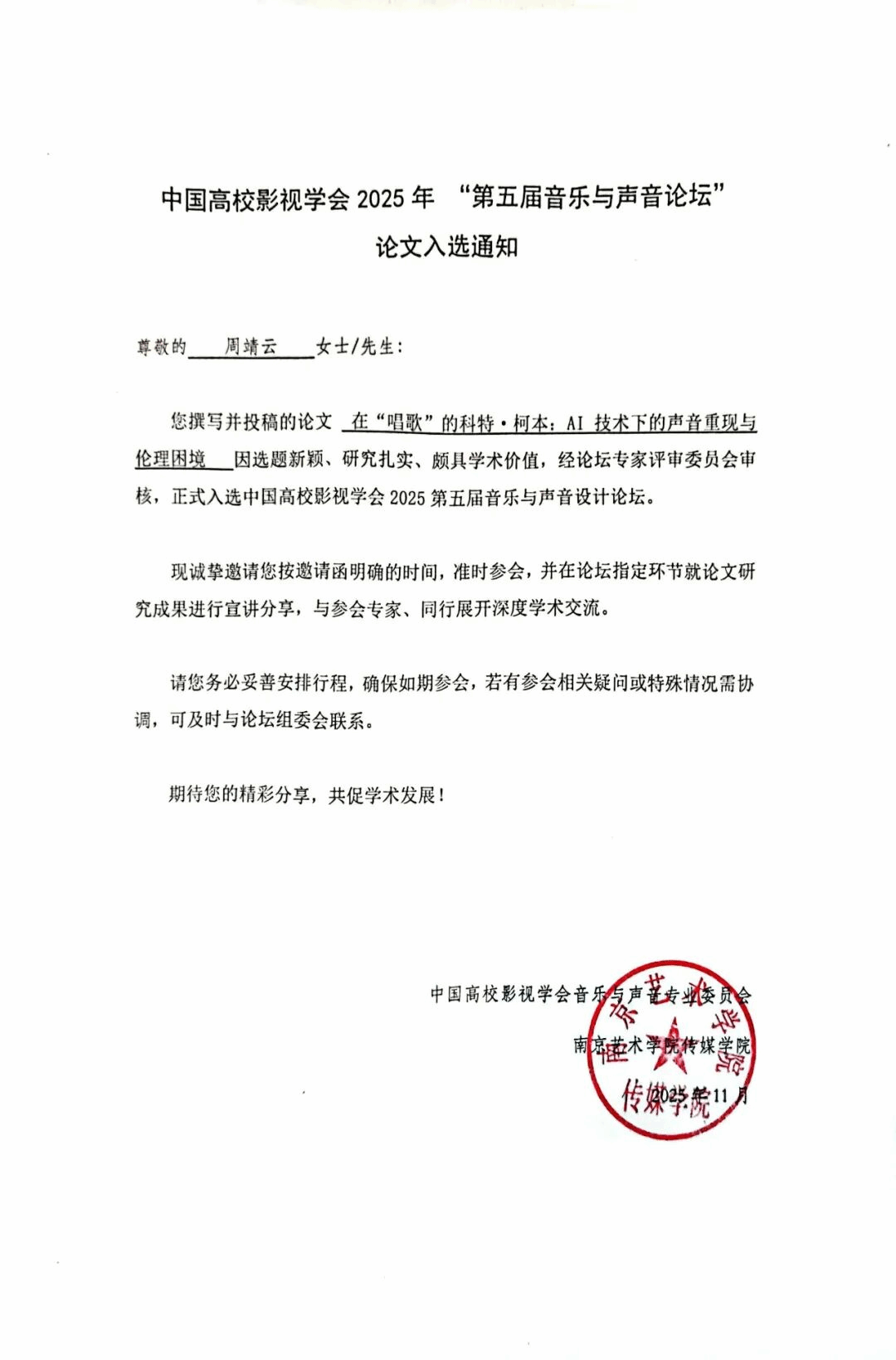 学术型研究生周靖云的论文成功入选本次会议(音乐与声音学术论坛五),并进行了现场宣讲。