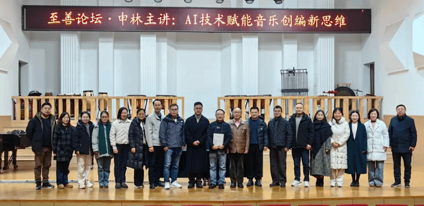 音乐科技系主任申林副教授,在“至善论坛”作题为“AI技术赋能音乐创编新思维”的专题讲座。他通过音频演示与技术解析,介绍了AI在声音合成、音乐创作等领域的前沿应用,探讨了AI与人类协作的音乐创作模式。