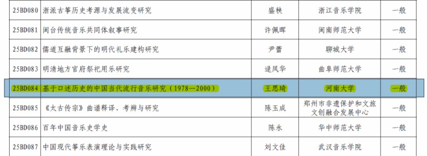 王思琦教授主持的《基于口述历史的中国当代流行音乐研究(1978-2000)》获批立项国家社科基金艺术学年度项目。