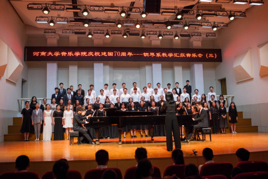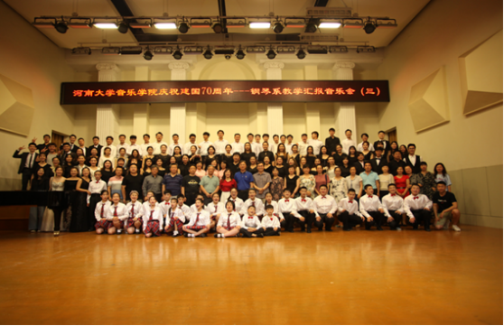 为庆祝建国 70 周年,6 ⽉ 19 ⽇晚,由钢琴系与音乐理论系联合承办的钢琴系教学汇报音乐会系列(三)暨 2018 级研究⽣《键盘和声》教学汇报音乐会在音乐厅举行。此次音乐会既是⼀场教学汇报,又是该课程以演代考方式的体现。