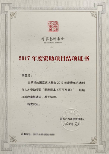 同期,由李玉昆主持的国家艺术基金2017年度青年艺术创作人才资助项目“歌剧剧本《可可西里》”也成功通过验收,准予结项。这个项目是他继2014年度获得国家艺术基金舞台艺术创作的小型剧项目,与2016年度获得国家艺术基金舞台艺术创作的大型剧项目之后,第三次完成的国家艺术基金舞台艺术创作项目。