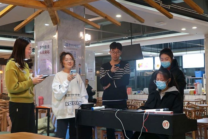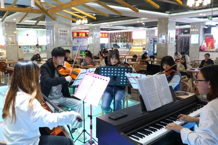 青年志愿者协会的小可爱们在明伦校区中心餐厅开展了实践活动。音乐会中,热情澎湃的红色乐章《灯火里的中国》扣人心弦;钢琴与二胡美妙碰击的《梁祝》、《我心永恒》唯美动人;优美动听的《越人歌》;还有那轻巧欢快的合唱《七月的草原》;弦乐四重奏的《哈利波特》……优美的乐声洒落在心窝里,宛如一些活泼轻盈的精灵,在为心灵进行一次洗礼。欢快的旋律使中心食堂的气氛活跃到了极致,同学们一边观看节目,一边享用晚餐,十分惬意。
