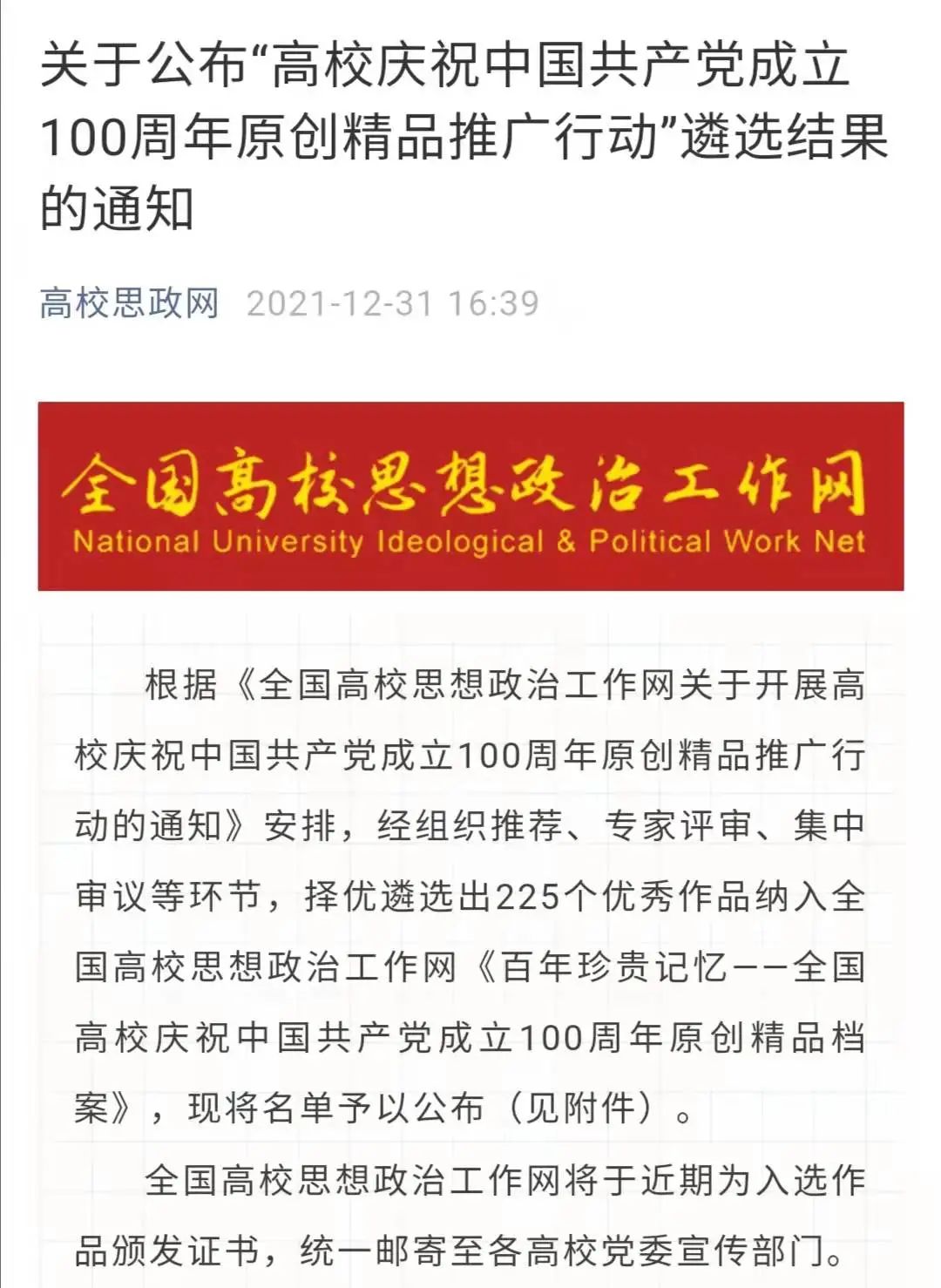 12月31日,教育部全国高校思想政治工作网发布《关于公布“高校庆祝中国共产党成立100周年原创精品推广行动”遴选结果的通知》,正妹av
