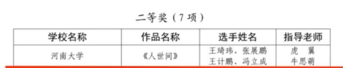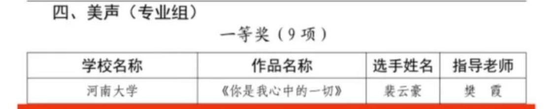 河南省大学生校园歌手大赛(民族类)《雪白的鸽子》荣获一等奖。《沂蒙山永远的爹娘》荣获三等奖。河南省大学生校园歌手大赛(通俗类)《保留》荣获一等奖。《引路的风筝》荣获二等奖。校园歌手大赛(美声组)《你是我心中的一切》荣获一等奖。《人世间》《黄河颂》荣获二等奖。校园歌手大赛(原创类)《想对您说》荣获二等奖。