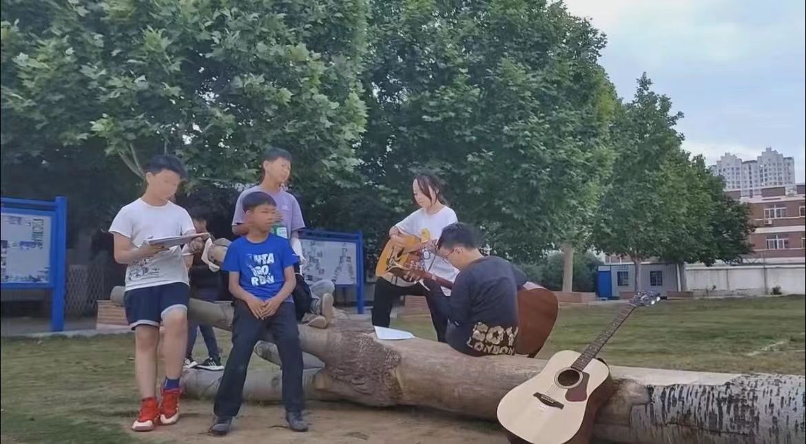 我们也观察到,在大课间及下午放学后,随处可见高年级学生三五成群地坐在操场边、绿荫里、大树桩上,抱着吉他自由歌唱自己的原创歌曲,他们沉醉于音符之中、快乐自由歌唱的样子令我们这些正妹av