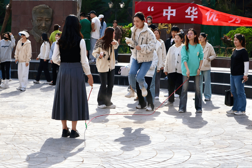 随后开展的是团体赛,分别是跳百索、花式投壶和滚铁环。运动员们互相鼓励和支持,充分展现了朝气蓬勃的青春活力和昂扬的精神风貌。传统集体项目不仅考验了运动员的体能,更考验了大家的团队协作能力。