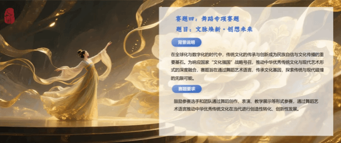 背景说明:在全球化与数字化的时代中,传统文化的传承与创新成为民族自信与文化传播的重要基石。为响应国家“文化强国”战略号召,推动中华优秀传统文化与现代艺术形式的深度融合,赛题旨在通过舞蹈艺术语言,传承文化基因,探索传统与现代碰撞的无限可能。