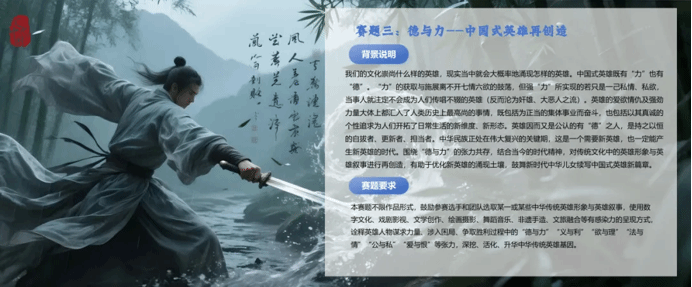 本赛题不限作品形式,鼓励参赛选手和团队选取某一或某些中华传统英雄形象与英雄叙事,使用数字文化、戏剧影视、文学创作、绘画摄影、舞蹈音乐、非遗手造、文旅融合等有感染力的呈现方式,诠释英雄人物谋求力量、涉入困局、争取胜利过程中的“德与力”“义与利”“欲与理”“法与情”“公与私”“爱与恨”等张力,深挖、活化、升华中华传统英雄基因。