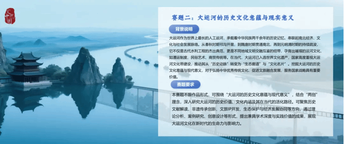 本赛题不限作品形式,可围绕“大运河的历史文化意蕴与现代意义”,结合“两创”理念,深入研究大运河的历史价值、文化内涵及其在当代的活化路径。可聚焦历史文献解读、非遗传承创新、文旅IP开发、生态保护与经济发展协同等方向,通过理论分析、案例研究、创意设计等形式,提出兼具学术深度与实践价值的成果,展现大运河文化在新时代的生命力与影响力。