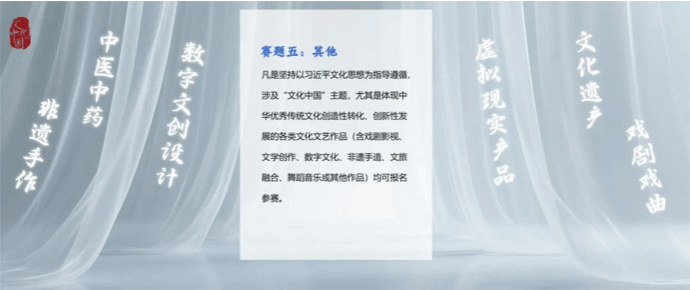 凡是坚持以习近平文化思想为指导遵循,涉及“文化中国”主题,尤其是体现中华优秀传统文化创造性转化、创新性发展的各类文化文艺作品(含戏剧影视、文学创作、数字文化、非遗手造、文旅融合、舞蹈音乐或其他作品)均可报名参赛。