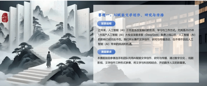 本赛题鼓励参赛选手和团队利用AI赋能文学创作、研究与传播,通过数字文化、戏剧影视、文学创作三种形式参赛,将文学与科技相结合,开启数字人文的新篇章。