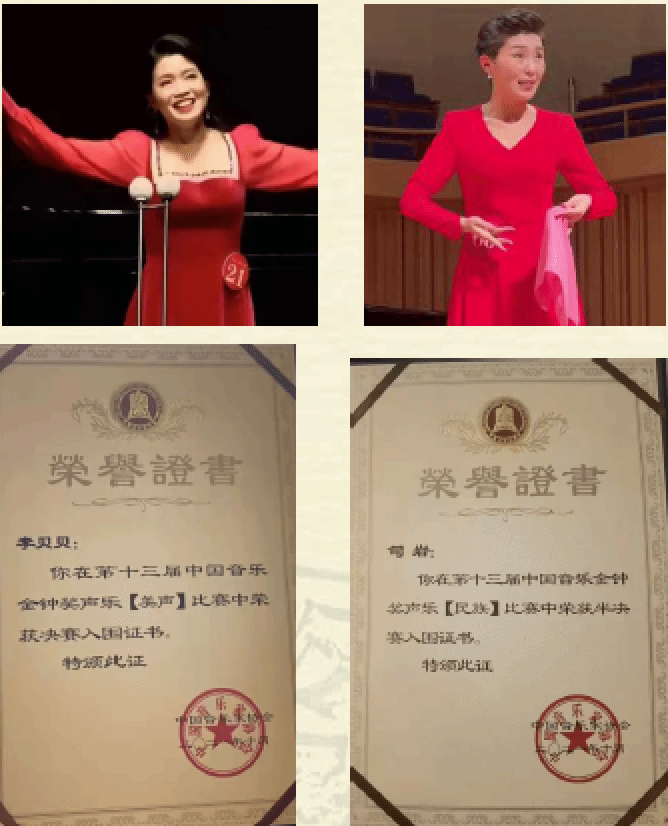 的教学质量和学术声誉做出了重要贡献。青年教师李贝贝、司岩分别荣获第十三届、第十四届“中国音乐金钟奖”美声组、民族组前10名。