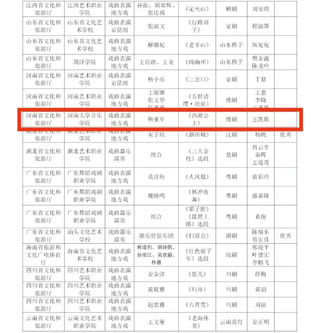 2021级戏曲演唱方向研究生靳亚军表演的豫剧《西湖公主》成功入选,同时荣获“戏曲盛世”2022全国首届戏曲网络大赛综合A组银奖。