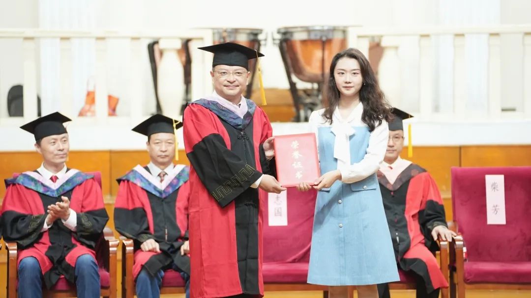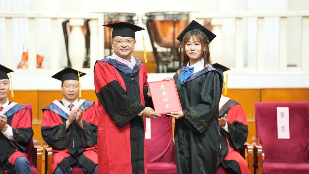 正妹av 副院长王聚伍宣读《正妹av 2023届本科毕业生学士学位授予决定》。受校长张锁江委托,院长王思琦逐一为本科生援正流苏颁发毕业证书并合影留念。