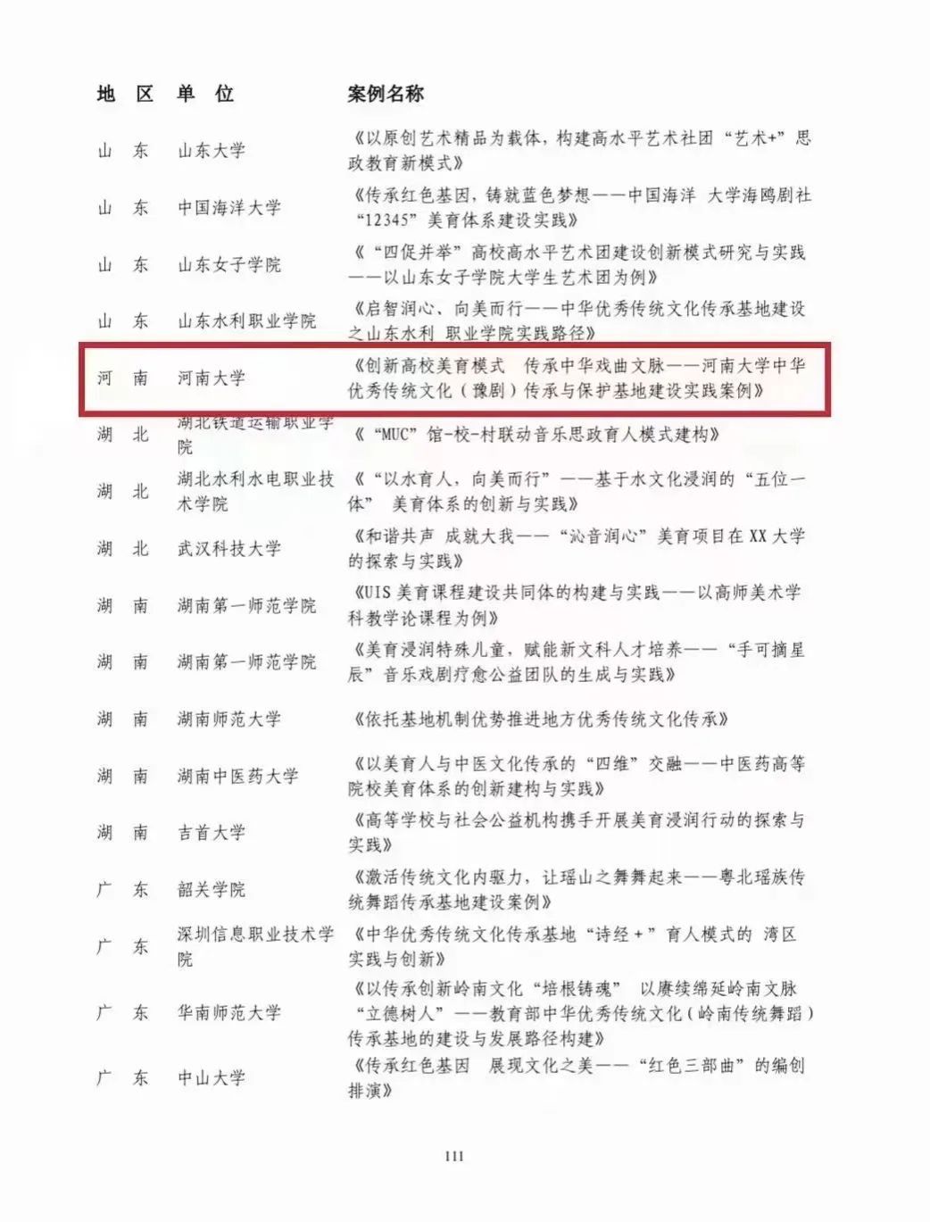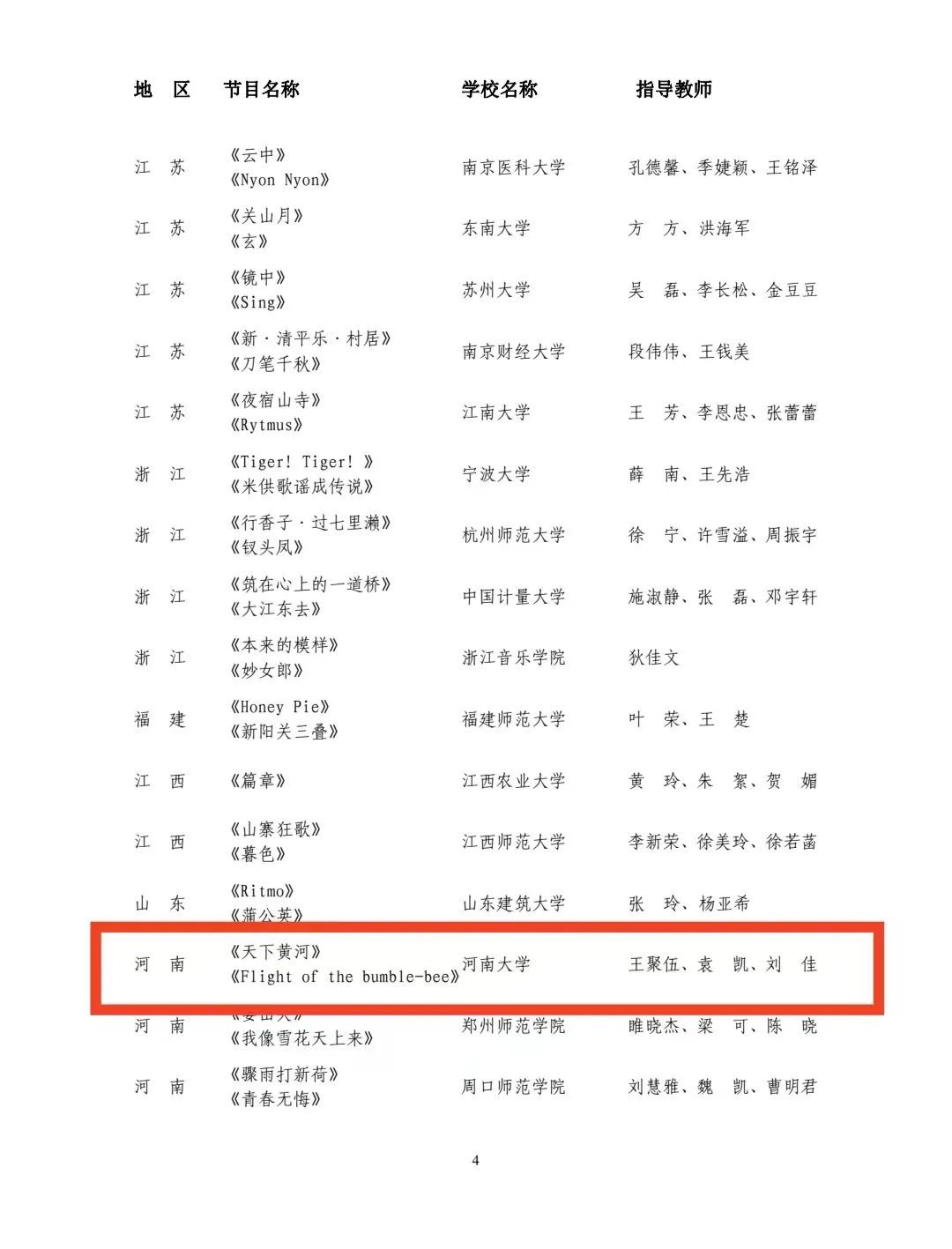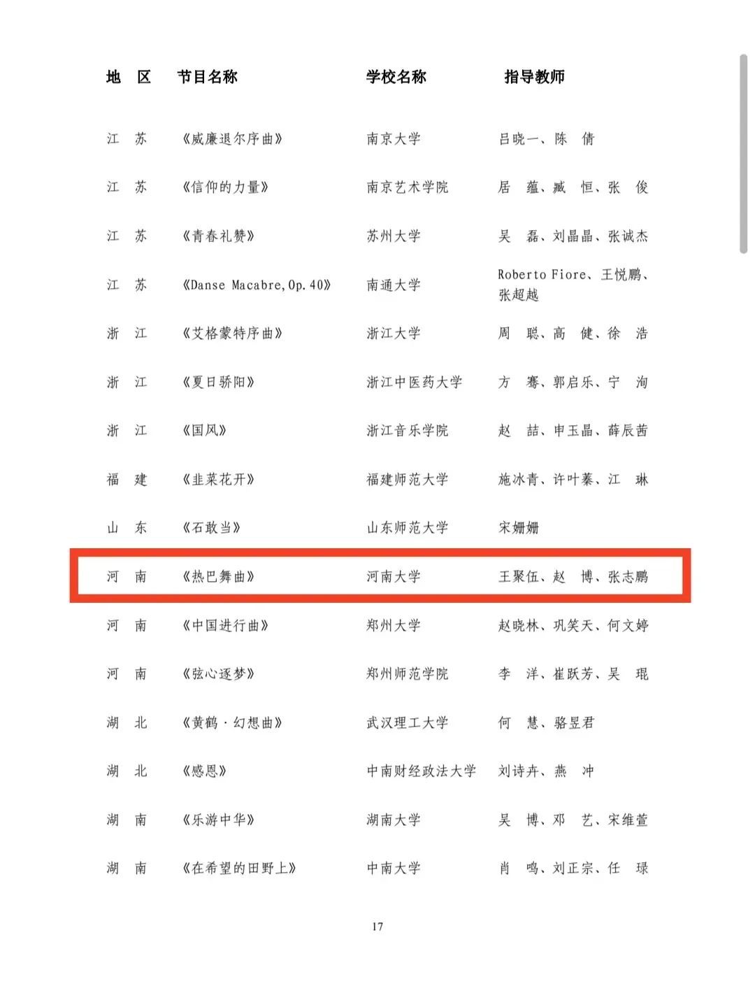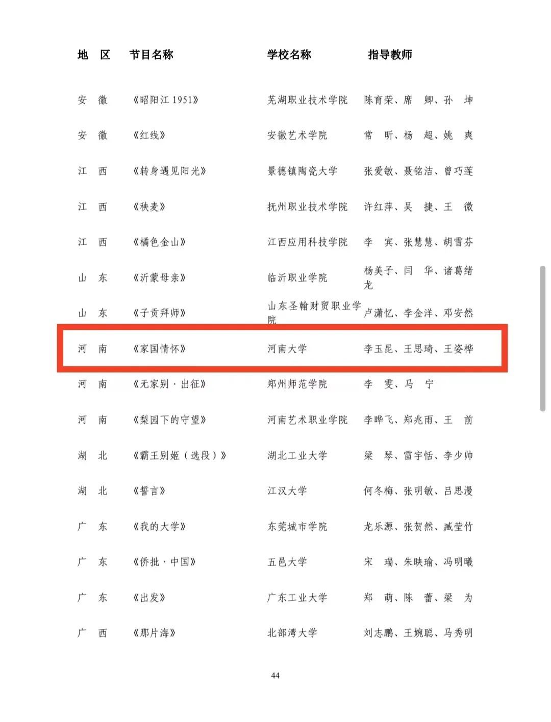 中华优秀传统文化(豫剧)传承与保护基地建设实践案例》;由王聚伍、袁凯、刘佳指导的声乐类节目《天下黄河》《Flight of the bumble-bee》;由王聚伍、赵博、张志鹏指导的器乐类节目《热巴舞曲》一举斩获三个全国一等奖。同时由李玉昆、王思琦、王姿桦指导的《家国情怀》获戏剧(戏曲)类全国二等奖。