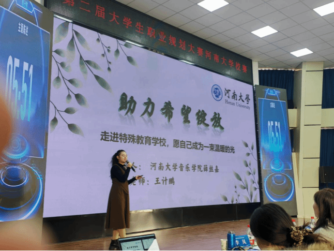 2023 级音乐表演1班的薛丝嘉同学以《助力希望绽放——愿自己成为一束温暖的光》为题参加决赛,最终以优异成绩荣获成长赛道校级三等奖,其指导教师王计鹏获“优秀指导教师奖”