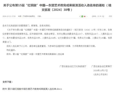 为全面贯彻落实党的二十大精神和党的教育方针,深入学习贯彻习近平文化思想,贯彻落实习近平总书记对广西重大方略要求,进一步扩大与东盟国家的人文交流与合作,构建更为紧密的中国—东盟命运共同体,由文化和旅游部科技教育司作为指导单位,广西壮族自治区文化和旅游厅、教育厅联合主办的第15届“红铜鼓”中国—东盟艺术教育成果展演活动于2024年10月在桂林市举办。