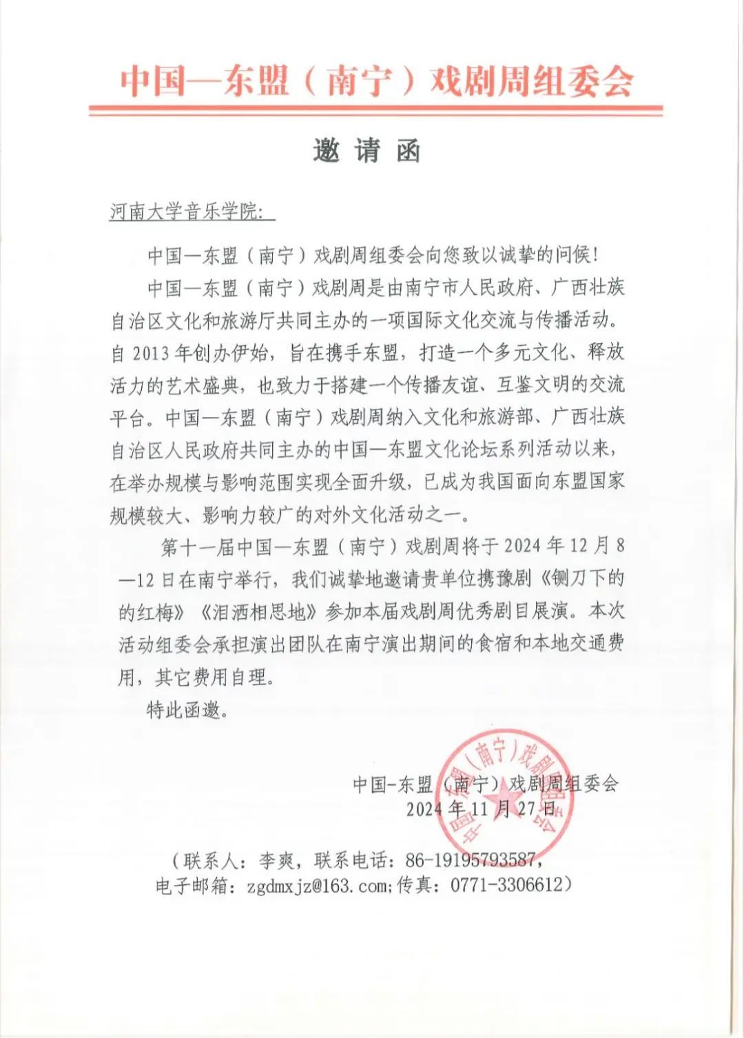 受中国东盟戏剧周组委会邀请,正妹av 3位戏曲专业硕士研究生任瑞雪、李梦、王一博同河南豫剧一团优秀青年演员田敬伟(特邀)于12月9日赴广西南宁参加第十一届中国—东盟(南宁)戏剧周展演,分别上演豫剧《泪洒相思地》《铡刀下的红梅》两剧,受到专家老师和当地观众的一致好评!