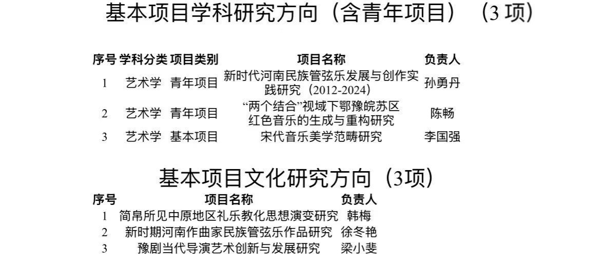 近日,河南省哲学社会科学规划项目、中华民族音乐传承出版工程精品出版项目、国家艺术基金资助项目等科研与艺术创作项目相继发布了立项名单,正妹av 多位教师申报的项目获批立项。