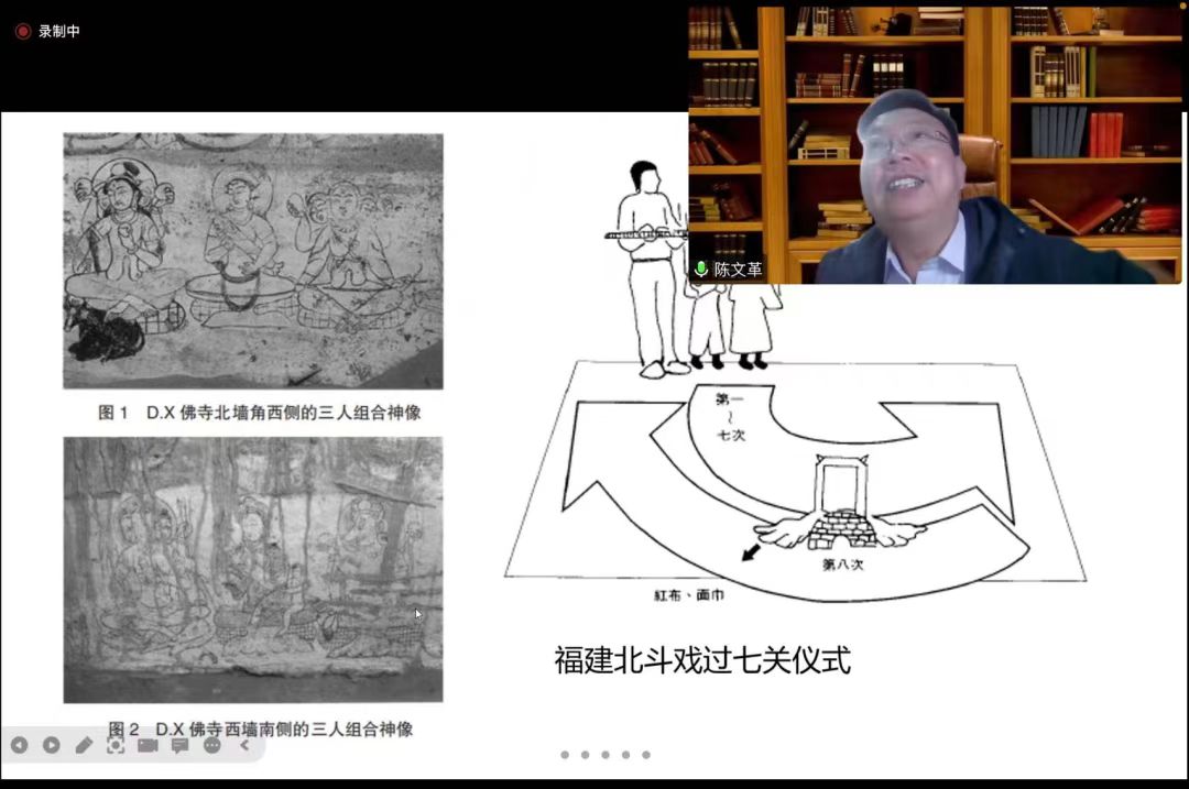 陈教授充分运用民族学、人类学、语言学、历史学等研究方法,将中国戏曲史的研究置于世界戏剧史发展演变的宏观背景中,通过细致入微的观察、独特的学术视角,将中西方戏剧的关联勾勒出来,并多有新见。他通过对历史文献中出现的诸多词牌、曲牌的梳理,对一些程式化的曲牌进行比较,通过图像-文字-民俗互证的方式,将戏剧戏曲史的话题延伸到了汉唐时期。他通过历时-共时的视角,把中西方戏剧发展过程中的具体艺术形态进行比照,探究中西方戏剧艺术发展之间的内在关联。陈教授对中西方文化中的七重纱、七重门、过七关、七七复仇等诸多与“七”相关的民间遗存展开的论述,引起了师生们的强烈兴趣,并引发了关于相关民俗话题的交流研讨。在分享的尾声,陈教授从思想史的角度对其关于“桥”的话题进行了总结,认为从“桥”的观念体现了汉、唐、宋人的思想转换,这种转换是从汉代的神仙思想,到唐代的佛教思想,再到宋代入世思想的历史转向。