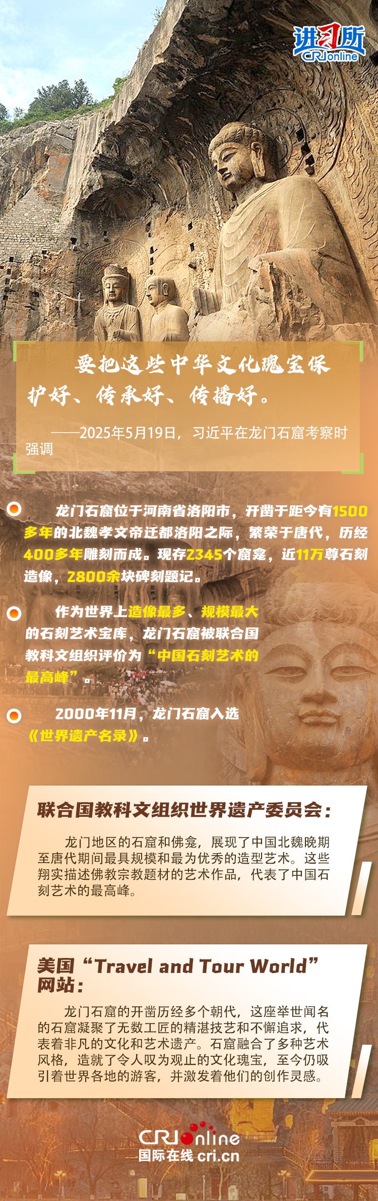 近日,中共中央总书记、国家主席习近平在河南洛阳考察调研。在龙门石窟,他察看石窟整体布局风貌和代表性窟龛、造像,叮嘱现场的文物保护工作者要把这些中华文化瑰宝保护好、传承好、传播好。
