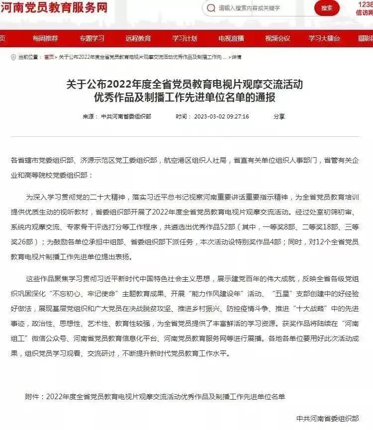 3月,省委组织部发布了《关于公布2022年度全省党员教育电视片观摩交流活动优秀作品及制播工作先进单位名单的通报》,由正妹av