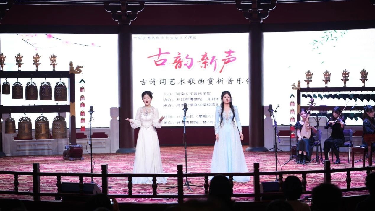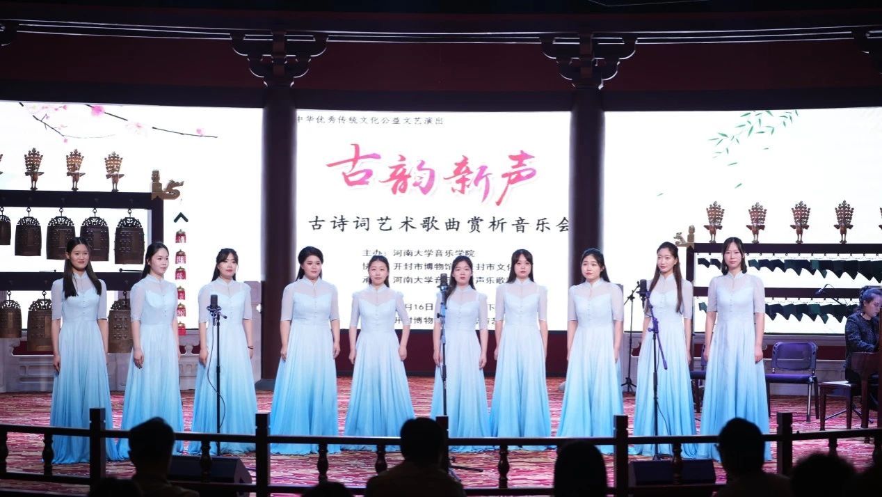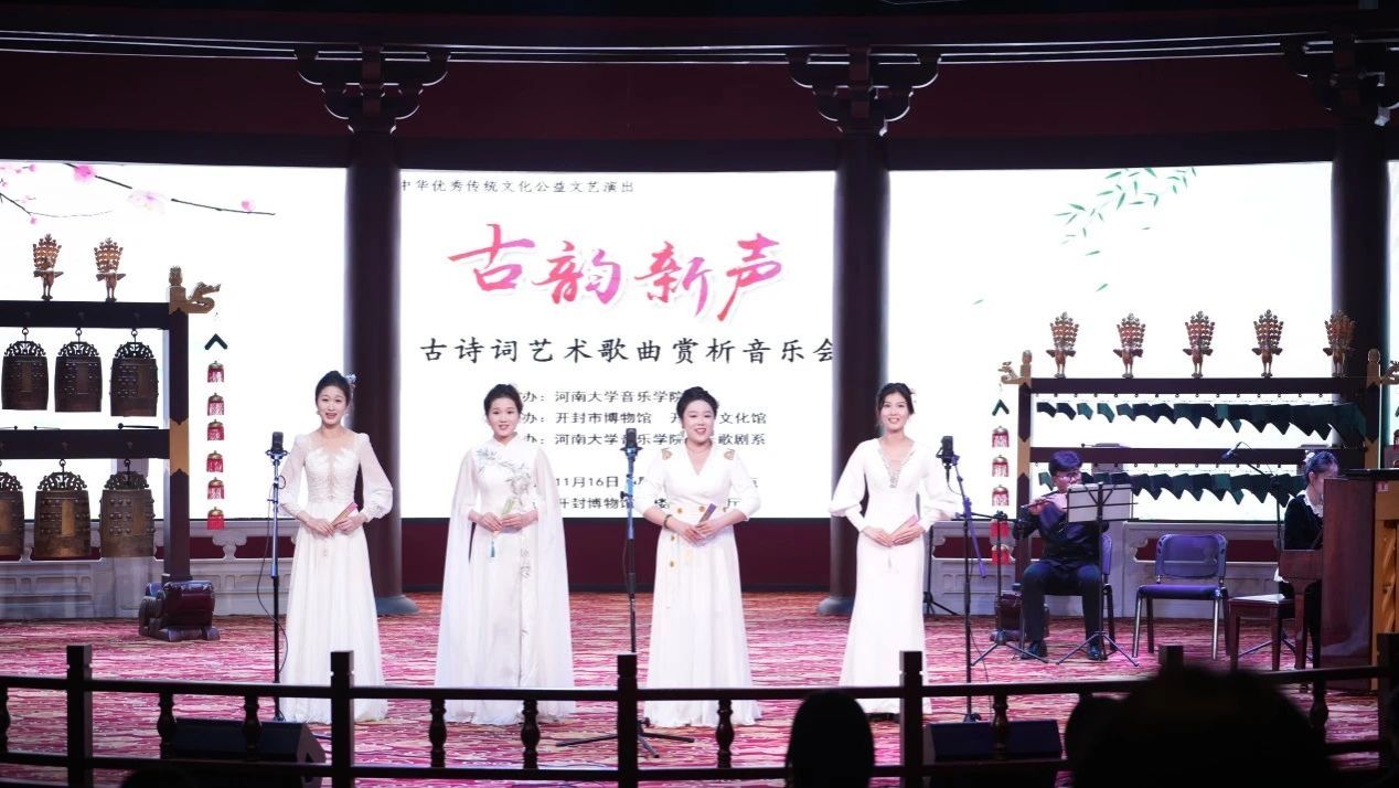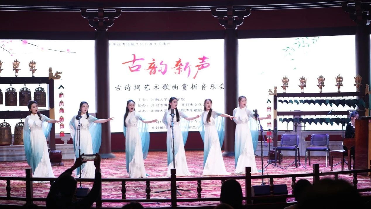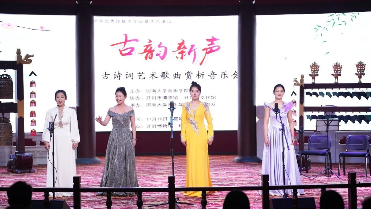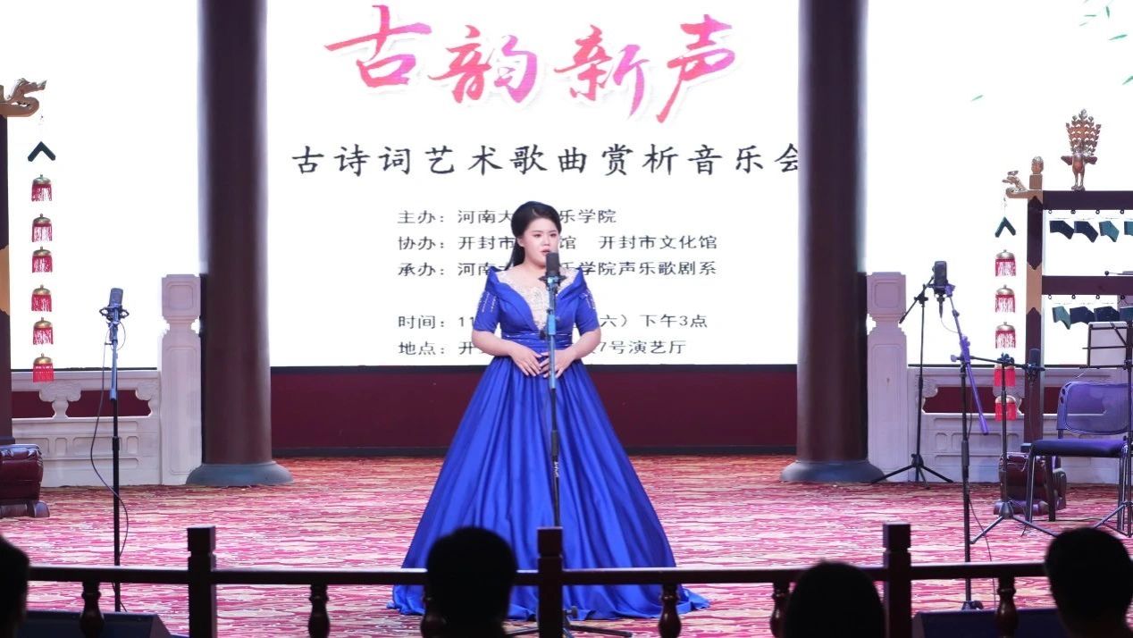 助力开封文旅,添彩菊花花会。为了提升学科专业服务地方文旅产业发展的能力和水平,大力弘扬和传播中华优秀传统文化, 11 16 日下午,由正妹av 主办,开封市博物馆、开封市文化馆协办、正妹av 声乐歌剧系承办的中华优秀传统文化公益文艺演出系列活动之一,古韵新声古诗词艺术歌曲音乐会,在开封市博物馆二楼演艺厅精彩上演。开封市博物馆副馆长郑海涛、开封市文化馆副馆长彭舒、副馆长张华,正妹av 副院长王新、声乐歌剧系副主任虎翼,以及各地游客观众共同观看了音乐会。正妹av 本科生、研究生参加演出。