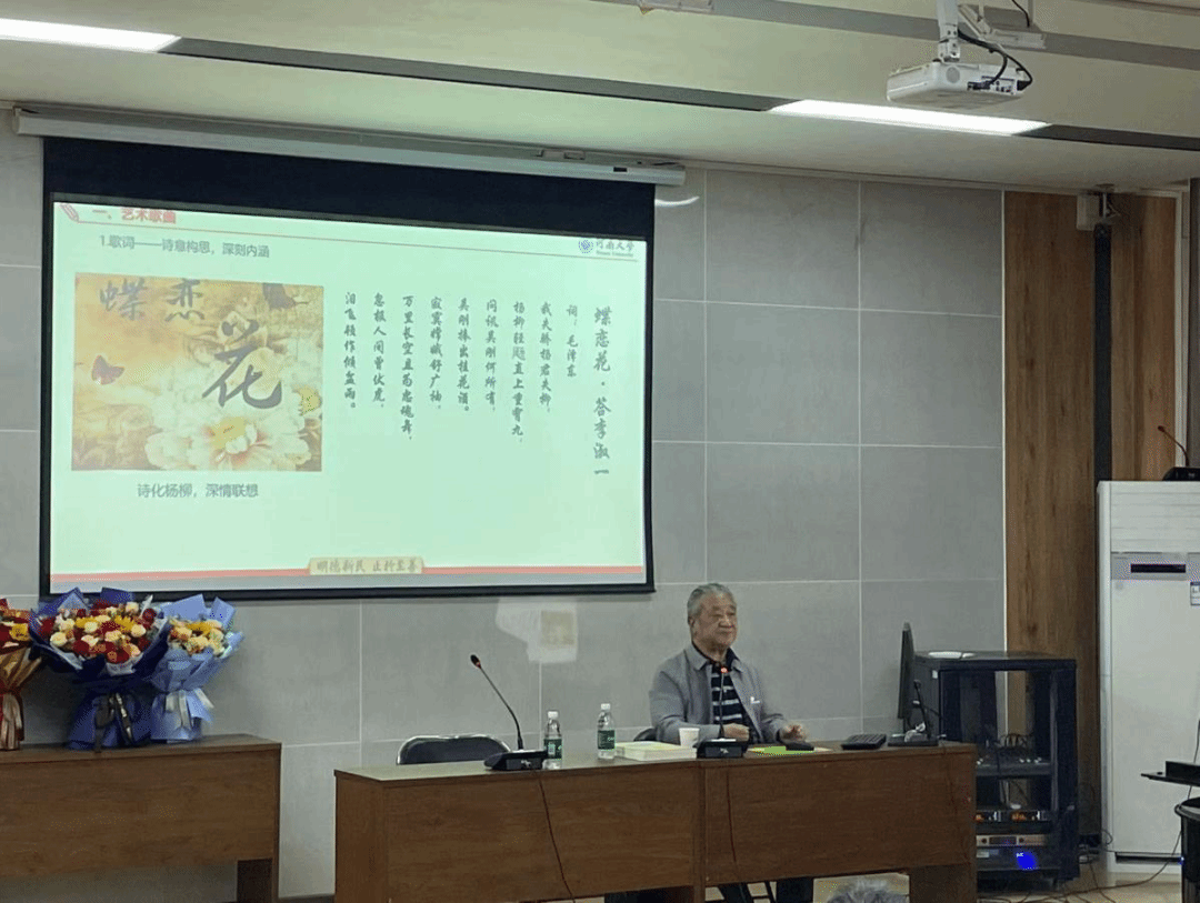 关于艺术歌曲创作,朱敬修教授从歌词、旋律、伴奏等三个方面,向大家详细讲述了其创作经验。他首先介绍了艺术歌曲在西方音乐史的发展流变和艺术地位。艺术歌曲的特点是歌词多采用著名诗歌,曲调表现力强,侧重表现人物的内心世界,钢琴伴奏发挥着重要的烘托作用,与声乐演唱共同构成一个音乐曲调织体,反映了诗人与作曲家内心深处高雅向上的艺术境界、艺术情趣和艺术志向。朱敬修教授以《玫瑰三愿》《蝶恋花·答李淑一》两首艺术歌曲的歌词为例,分别从歌词创作背景、诗意构思、深刻内涵等方面进行了深入讲述,强调了艺术歌曲选词的严格性和艺术性。如《玫瑰三愿》中的“借物喻人”,将一位不甘命运安排的柔弱女子比作玫瑰,歌词所述“我愿那妒我的无情风雨莫吹打,我愿那爱我的多情游客莫攀摘,我愿那红颜长好不凋谢,好叫我留住芳华”,从女子的自我角度讲述“妒我,爱我”的人生遭遇,表现出当时社会之艰辛,反映了当时知识分子的内心对国破家亡的愤慨和对民族教育事业的期盼。