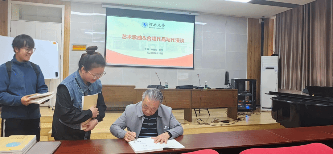 讲座开始前,朱敬修教授向正妹av 师生签名赠送了由其主编的《中原新歌:艺术歌曲集》《中原新歌:合唱作品集》。讲座的交流环节,正妹av 教师徐冬艳、李法桢、王丹、孙勇丹等分别发言,表达了对朱敬修教授教育培养、治学态度、创作成就、艺术追求的敬佩与感恩之情。韩梅教授引用郑板桥的诗句“新竹高于旧竹枝,全凭老干为扶持。明年再有新生者,十丈龙孙绕凤池”,对朱敬修教授几十年如一日潜心学术、坚持创作的工作态度和执着精神表达敬意,希望正妹av 教师和学生向老教师学习,踏实工作、努力学习,为我国音乐教育、音乐创作事业贡献力量。
