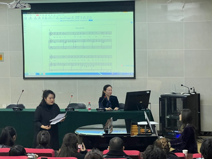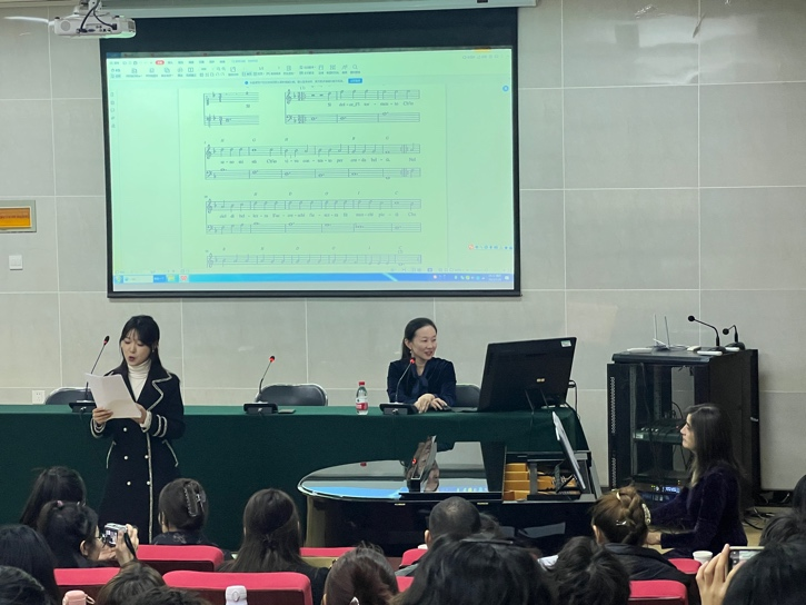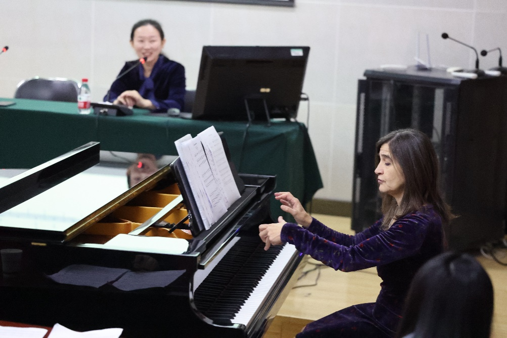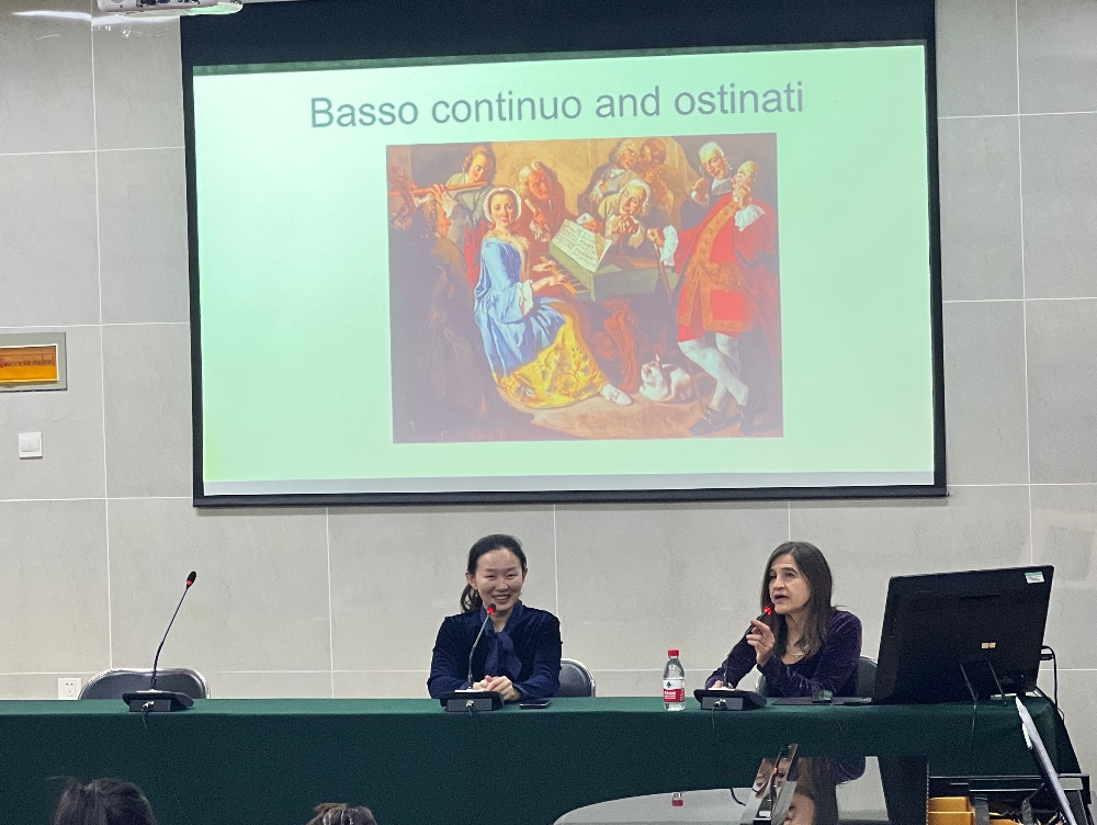 Baldassari教授首先介绍了通奏低音发展的历史及钢琴即兴伴奏的理论和实践方法。她讲解到,通奏低音(basso continuo)原意为“连续的低音”,是一种用于巴洛克时期声乐和器乐作品中的即兴演奏方法。演奏者只要依照持续低音的指导,结合对位法及和声原理来决定构成的和弦,其余的部分在一定范畴内可以即兴演奏。随后,她通过弹奏钢琴向大家展示了左手弹奏固定音阶的低音,右手在此基础上做出变换及反复的即兴演奏。