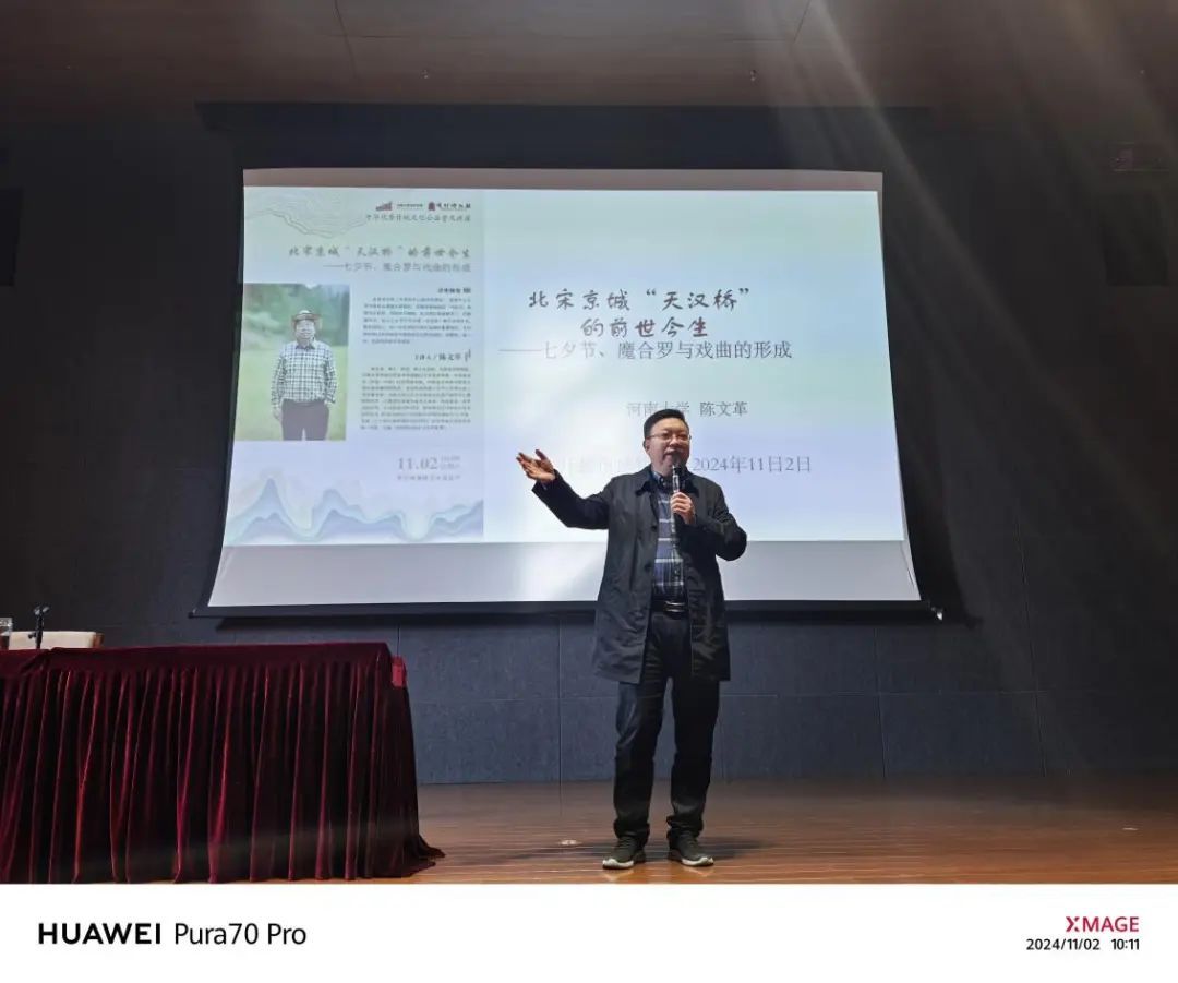 讲座的第三部分,陈教授介绍了天汉桥在戏曲文化起源中的影响,分析了“过关戏”“麻婆子”“耍孩儿”等北宋时期的傀儡戏等民俗活动如何促进了戏曲的萌芽与形成,揭示了宋人七夕节于天汉桥举行过桥仪、售卖泥孩儿演变为宋代戏曲的重要程式。