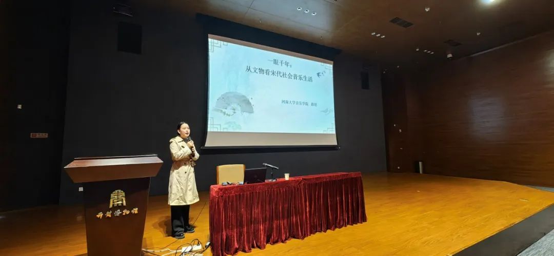 副教授、硕士生导师薛培博士做题为“一眼千年:从文物看宋代社会音乐生活”的专题讲座。薛培老师首先从宋代政治、经济、文化等多维视角,对宋代音乐文化繁荣的社会背景进行了概述。然后她以图文并茂的形式,从宫廷礼乐、民间音乐、宗教音乐和文人雅乐等四个方面对宋代的社会音乐生活进行详细介绍。