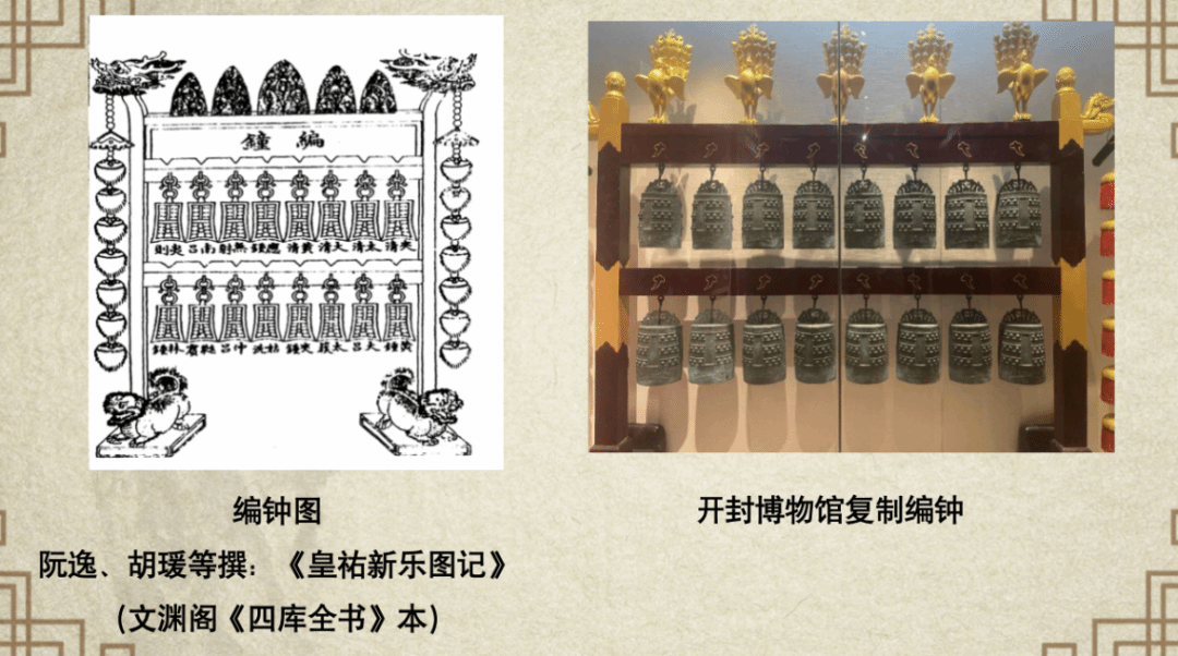 关于宫廷礼乐代表性乐器大晟编钟,薛培老师从开封博物馆馆藏大晟“夷则”钟讲起,为观众梳理了宋代雅乐改革始末,从编钟制作、定律、铭文等方面阐述了大晟编钟的文化内涵。整套编钟每编28件,达12编之多,总共336件,规模宏大,贯穿徽宗朝治史前后及宫廷内外的礼乐活动,是“崇宁新政”的重要组成部分。大晟乐及其乐器的变迁发展反映了科技进步、经济繁荣,以及礼乐多变、社会思潮各呈异彩的世风。