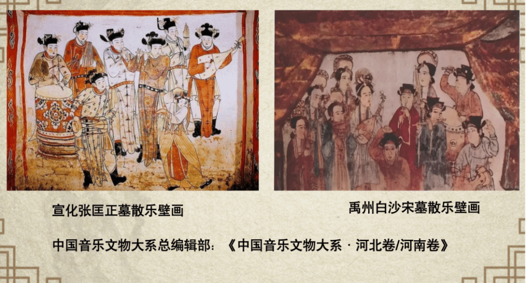 在民间音乐方面,薛培老师从伎乐砖雕入手,向观众展示了河南出土杂剧砖雕中末泥色、副净色、副末色及装孤色等戏曲形象;吹筚篥、击拍板、大鼓、腰鼓等散乐伴奏形象,参照史料指出伶人作戏的娱乐、鉴戒、讽喻、礼仪等作用。对出土壁画、石刻及传世画作中的说唱音乐、宗教音乐等不同艺术形式加以梳理和讲解,并与其他区域考古发现相结合,从“大宋史”的视角,一方面实证宋代多民族音乐文化的交流、交往、交融;另一方面再现宋代汴京茶楼酒肆、瓦子勾栏、市井里巷中歌舞、伎乐、杂耍等音乐内容,笙箫竞奏,百戏鼎沸。