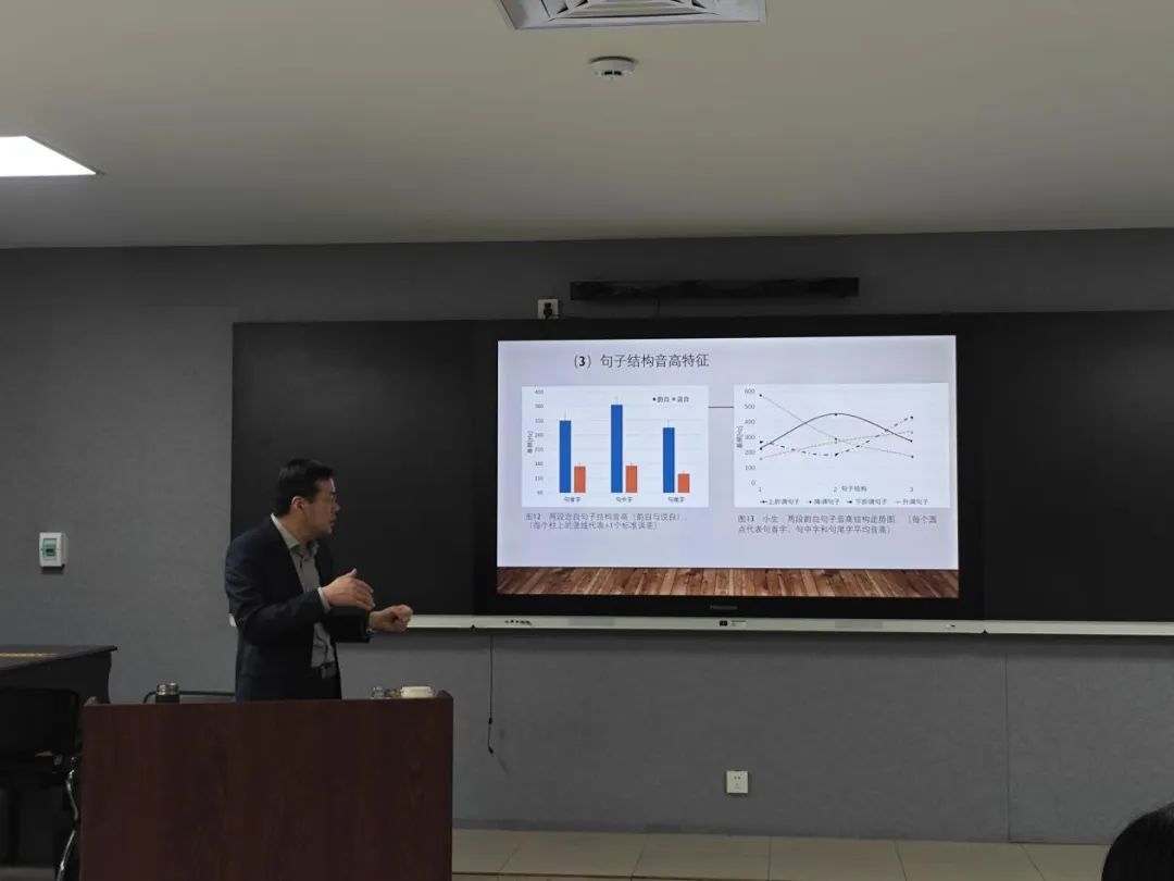 讲座伊始,韩教授从音乐学、生理学等角度介绍了戏曲表演程式中的不同声音属性,并介绍了语言学领域的研究现状与成果,通过“声学”的研究视角来研究昆曲行当的念白具有一定的科学意义。韩教授提到,昆曲念白有音乐性和语气化两大要领,历代学者、曲家对昆曲的字声规律主要停留在“言传身教”中,在近半个多世纪的研究中,昆曲是否在坚守传统规律,还是在时代发展的浪潮中发生了变化?基于此问题,韩教授通过研究音高、音量和音长的物理特征,比较它们在韵白与念白方面的差异性,进一步归纳出该行当念白的基本规律。