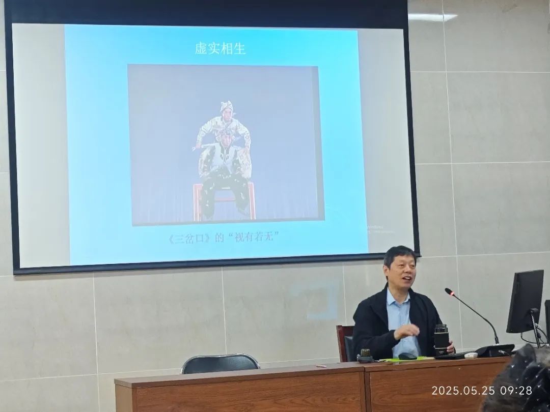 此外,冉常建教授向师生们阐释了表意主义戏剧“变形传神”的创作方法,即通过艺术加工,将生活中的写实形态转化为具有审美价值的表意形态,以意象化表达传递故事的神韵与意趣。他强调,在戏曲艺术创作中,艺术家需对生活素材进行创造性转化,以适应不同故事内容的表达需求。表意主义戏剧以唱念做打为核心的表意形式,超越了外在形似,追求内在意念的真实,通过动作虚拟和环境虚拟,构建出意象与情境交融的艺术世界。诸如《倩女离魂》《牡丹亭》等经典剧目,便以灵魂出窍、死后还魂等奇幻情节,展现了独特的艺术魅力。冉常建教授指出,戏曲演员的歌舞化表演超越了生活原型,充满音乐韵律之美,本质上就是一种表意性的艺术表达。